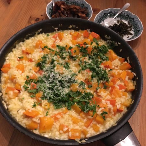 - Zwiebeln und Knobi anbraten, Kürbiswürfel dazu